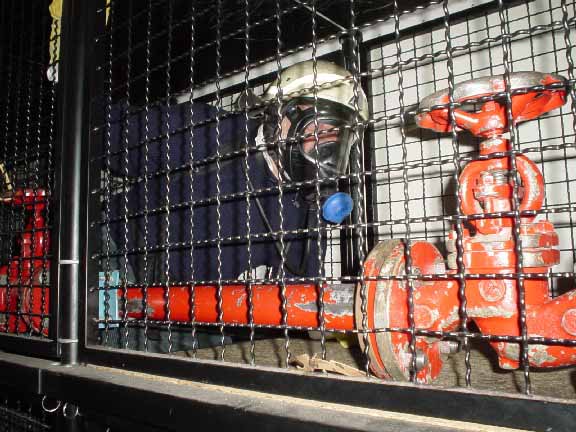 | Exercise for working with the BA sets. The "cage" consists of connected cubes of 90x90x90 cm with all kinds of doors, hatches, valves, narrow spaces, etc. and is about 15m long. It is pitch dark with artificial smoke, noise and temperatures up to 120°. The idea is to simulate the situation you find when fighting a fire in the engine room, cargo spaces or elsewhere inside a ship. |