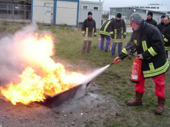 | Employing a powder extinguisher towards a real fire. |