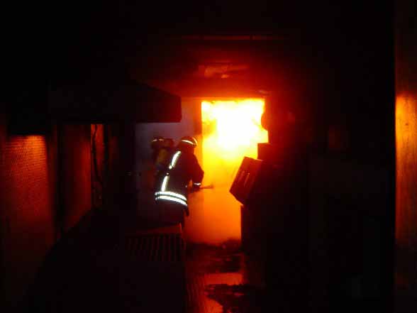 | Fighting a real fire in the "burning container" with the hose pipe in full fire fighting clothing and breathing through the BA set. |